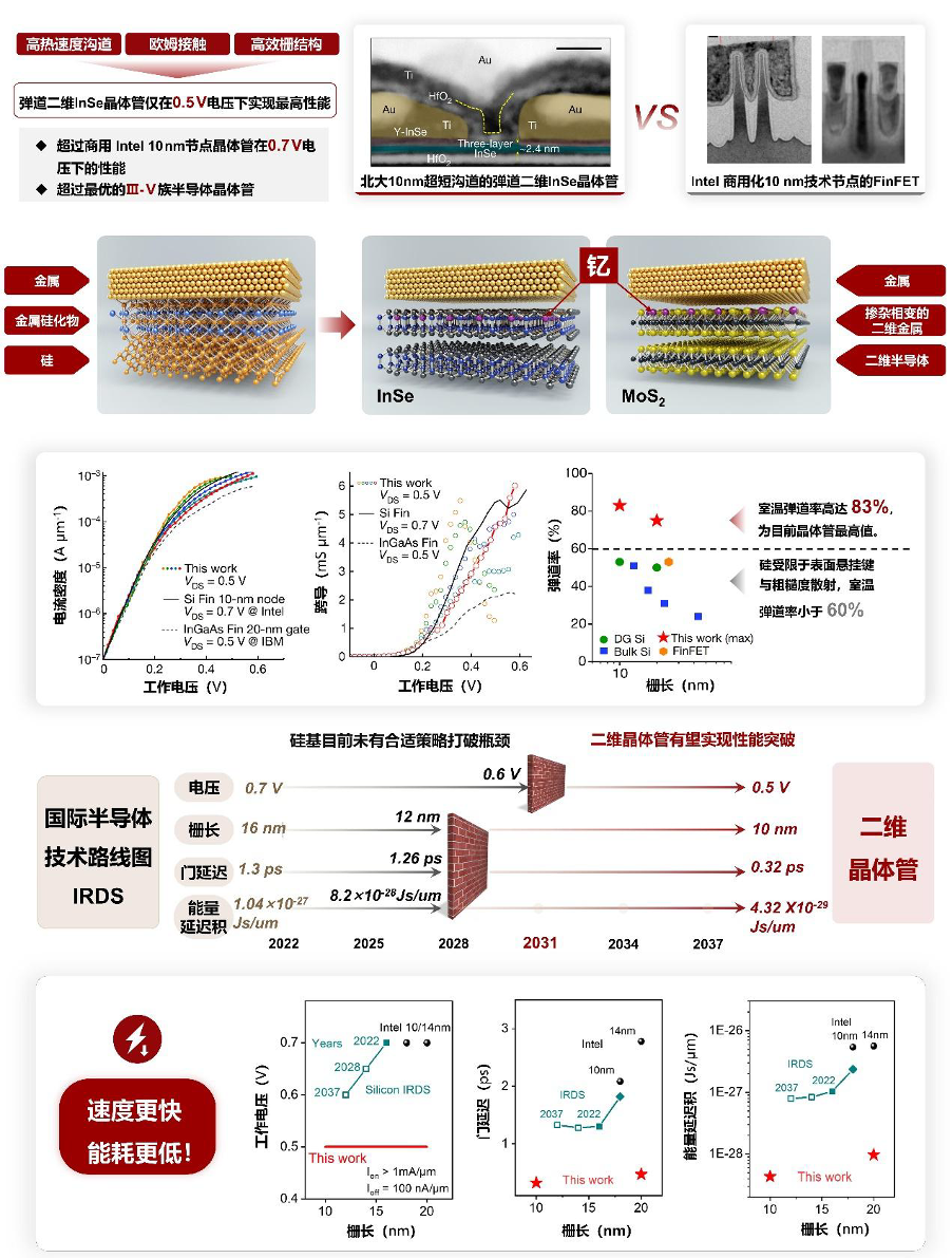 北京大学彭练矛、邱晨光团队构筑了10纳米弹道二维硒化铟晶体管,创造性地提出“稀土钇元素诱导二维相变理论”,并发明了“原子级可控精准掺杂技术”,从而成功克服了二维电子器件领域金属和半导体接触的国际难题,首次使得二维晶体管实际性能超过业界硅基10纳米节点Fin晶体管和IRDS预测的硅基极限。将二维晶体管的电压降到0.5V,延时仅为硅基极限的1/4,功耗降为1/3,室温弹道率提升至所有晶体管最高纪录83%,研制出国际上迄今速度最快、能耗最低的二维晶体管,该技术有望在未来亚1nm技术节点实现高速低功耗芯片。相关成果2023年3月22日发表于《自然》(Nature,616,470—475,2023),第一作者为电子学院博士研究生姜建峰和徐琳博士。