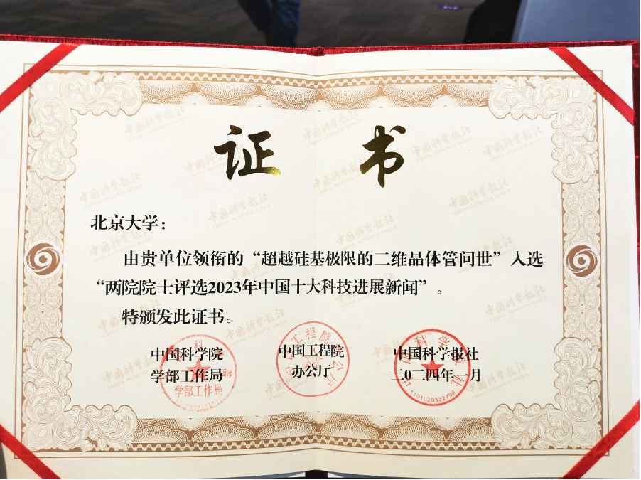 由中国科学院、中国工程院主办,中国科学院学部工作局、中国工程院办公厅、中国科学报社等承办的中国科学院院士和中国工程院院士投票评选的2023年中国十大科技进展新闻、世界十大科技进展新闻于2024年1月11日揭晓。北京大学电子学院彭练矛院士-邱晨光研究员团队成果《超越硅基极限的二维晶体管问世》入选“2023年中国十大科技进展新闻”。