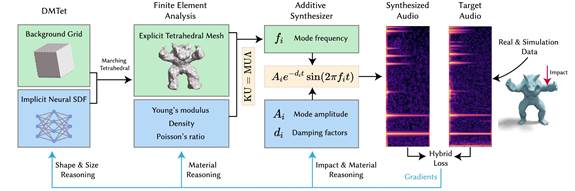 准确估计和模拟物体的物理属性从现实世界的声音录音中提取,对于视觉、图形和机器人等领域具有重要的实际意义。以往的刚体或软体模拟技术无法直接应用于模态声音合成,因为音频的高采样率,而以前的声音合成器往往未能充分建模发声物体的准确物理属性。论文提出了DiffSound,一种用于基于物理的模态声音合成的可微声音渲染框架,该框架基于隐式形状表示、新的高阶有限元分析模块和可微音频合成器。论文方法能够解决广泛的逆向问题,包括物理参数估计、几何形状推理和撞击位置预测。