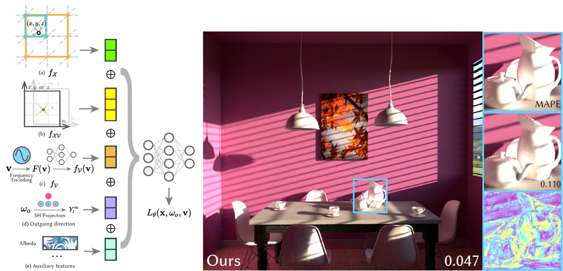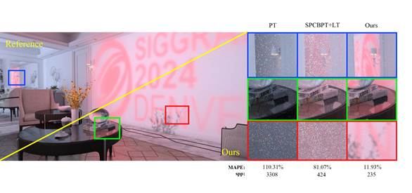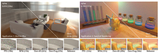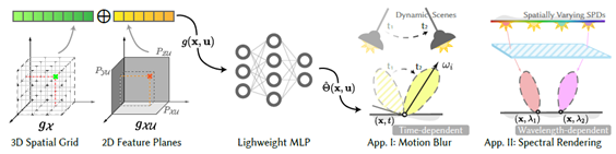 以往的路径引导策略使用3D的数据结构来建模空间位置与入射辐射度分布间的关系,但较难建模除空间位置(3D)之外的维度,例如动态场景在时间维度上的变化。而将这些数据结构直接扩展到更高的维度却常因维度诅咒而导致运行低效。论文探究如何由紧致的神经隐式表示来高效地建模辐射分布所依赖的额外维度,从而增强路径引导算法在特定渲染应用中的性能,例如光谱渲染与动态场景中的运动模糊效果。具体而言,论文使用特征平面分解的策略建模空间位置与额外维度间的相关性;同时提出使用渐进式的训练策略近似这种相关性,从而避免额外的数据结构开销。论文在若干典型的渲染应用与困难场景下体现了优势。论文被SIGGRAPH Asia’24会议轨接收,第一作者为实验室硕士生董宏昊,合作者包括研究生苏睿、汪国平教授、李胜研究员(通讯作者)。