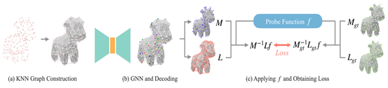 图形学中几何处理中的核心算子之一是拉普拉斯算子,其在物理仿真、几何计算等下游应用中具有重要地位。拉普拉斯算子起初定义在流形上,在三角网格和多边形网格等具有拓扑结构的三维表示方式中可以较为自然地推广,但对于点云这样的缺乏拓扑信息的无序结构而言,构建拉普拉斯算子及进行后续运算是非常困难的。论文探究了如何在不构建三角化或重建网格的情况下,通过观察拉普拉斯算子的性质,利用图神经网络估计点云上的拉普拉斯算子。为了训练网络,提出了一种新的训练方案,通过构建一个个“探测器”,不断“探测”目标拉普拉斯算子的性质,从而训练出一个具有泛化性的,用于预测点云上拉普拉斯算子的图神经网络。论文被SIGGRAPH Asia’24期刊轨(ACM Transactions on Graphics期刊)接收,第一作者为实验室直博生逄博,合作者包括研究生郑中天、李翼龙、汪国平教授(通讯作者)和王鹏帅助理教授(通讯作者)。