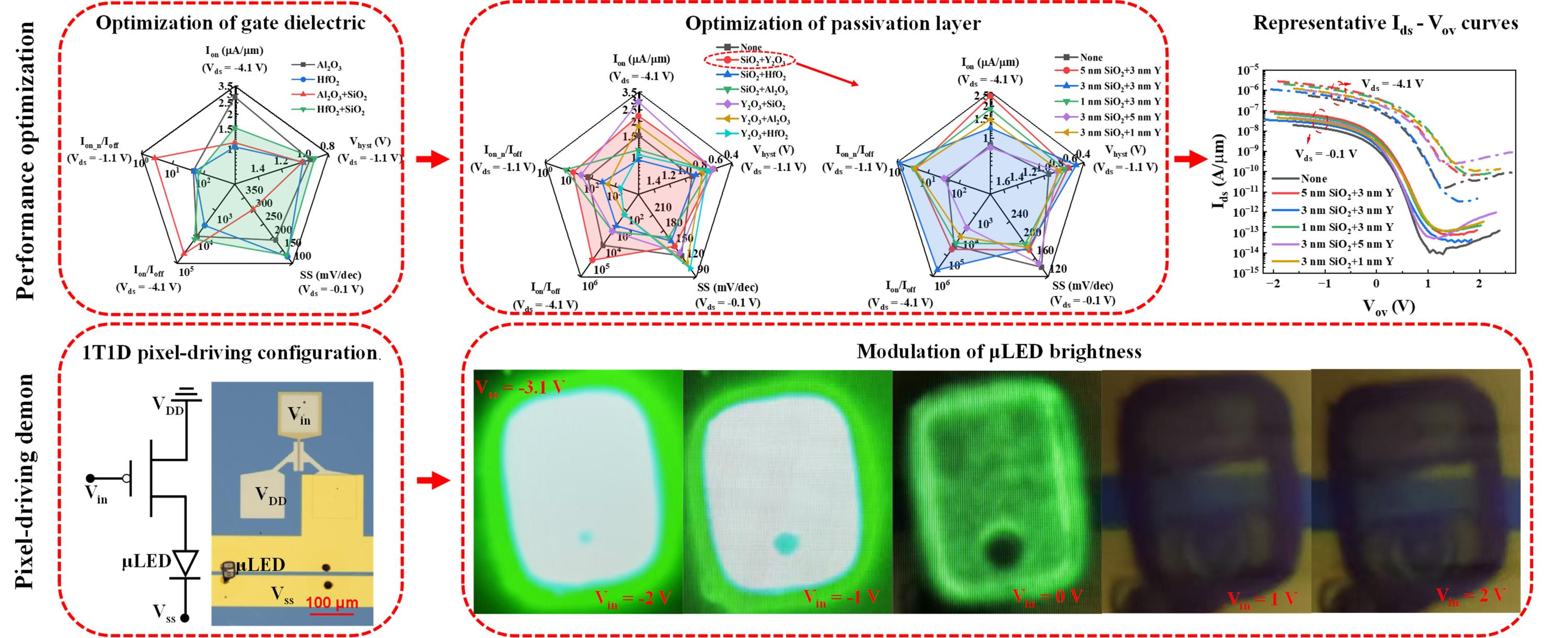 北京大学∙山西碳基薄膜电子研究院研发团队联合成都辰显光电有限公司,通过优化CNT TFTs的栅介质层和钝化层,实现了针对显示驱动应用的性能指标综合优化。采用HfO2/SiO2叠层作栅介质、SiO2/Y2O3叠层作钝化层的CNT TFTs,10 μm沟道长度器件的平均Ion为1.2 μA/μm,在Vds为-0.1 V时,Ion/Ioff在Vds为-0.1 V和-4.1 V时分别超过106和105,SS低至180 mV/dec,Vhyst低至0.5 V,并且几乎没有双极性;2 μm沟道长度器件的平均Ion高达到16.4 μA/μm,代表了微米级沟道长度CNT TFTs最佳整体性能。基于这些优化的CNT TFTs,成功展现了对micro-LED像素的有效调制。