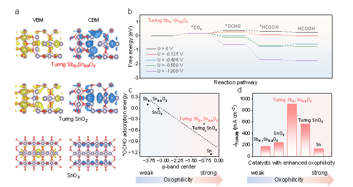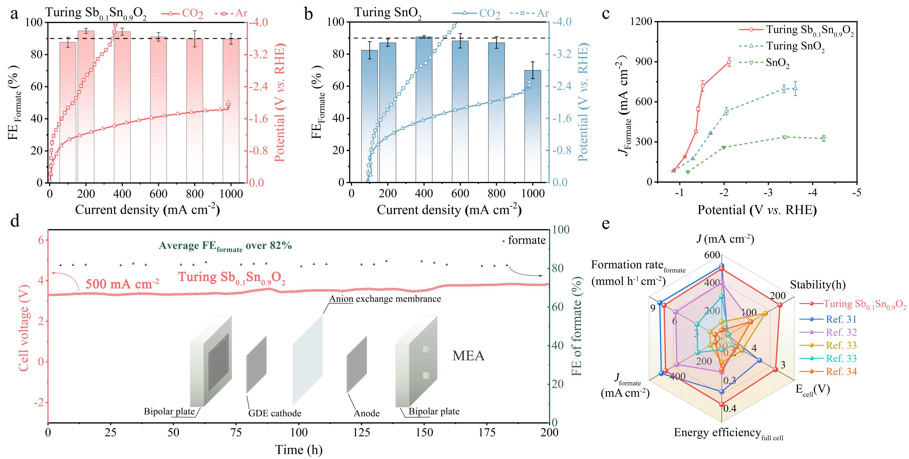 二氧化碳电催化转换器件性能研究表明,在碱性和酸性的流动池中,图灵型氧化锡锑纳米片均实现了1000 mA cm-2工业电流密度下的高效CO2电还原合成甲酸盐性能(图3a),甲酸盐法拉第效率高达92%;在MEA电解槽中,图灵型氧化锡锑纳米片在3.3V的超低槽压下,实现了高工业级电流密度(2500 mA,500 mA cm-2)下200 h稳定运行纪录,全电池能量效率高达39.1%,甲酸盐生成速率高达8.0 mmol h-1cm-2(图3d),超越了现有文献报道的二氧化碳电制甲酸盐电解槽的最高水平(图3e)。