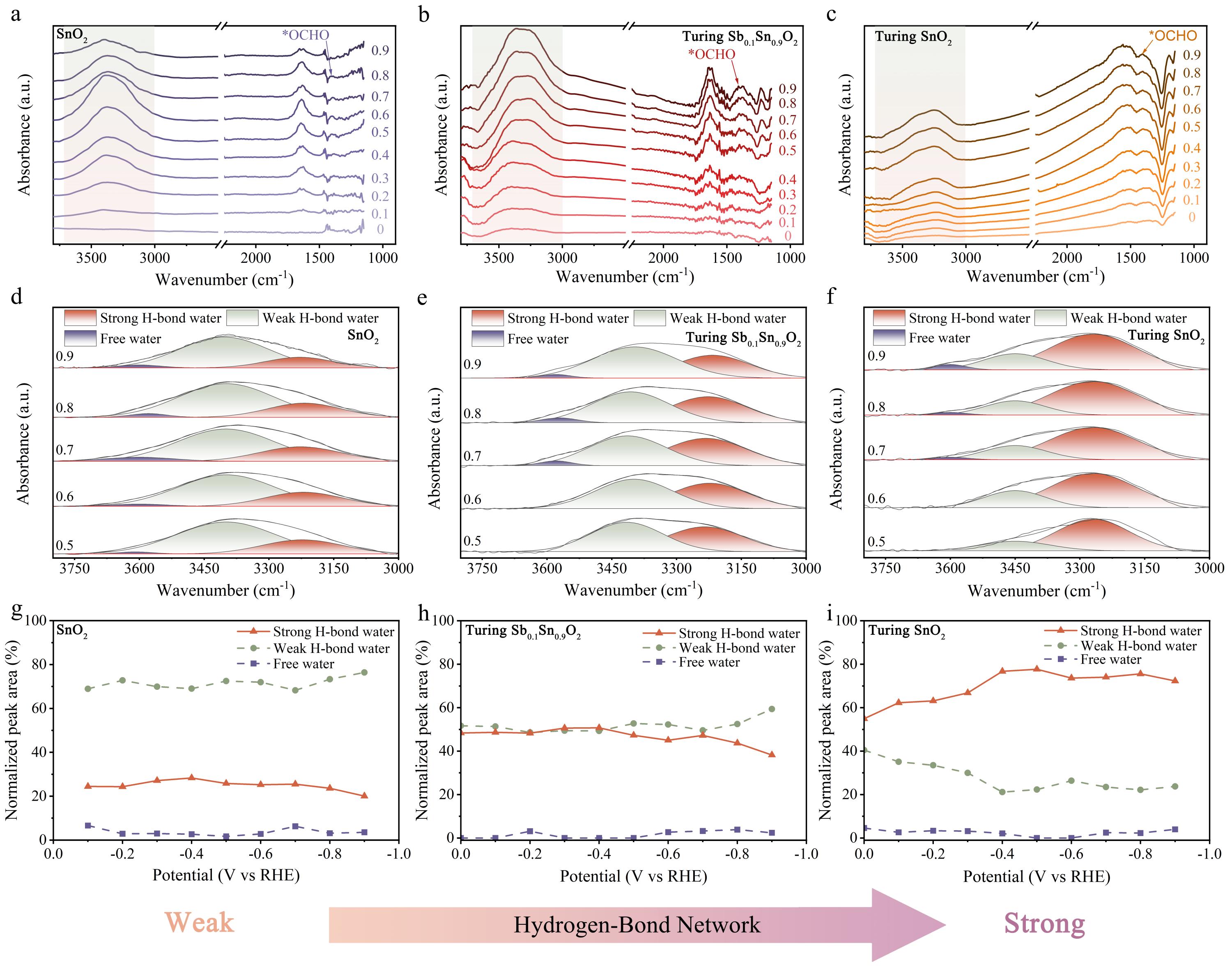 原位ATR-FTIR研究结果(图4)表明,图灵结构上的4-HB/2-HB界面水比(图灵SnO2为3.10,图灵Sb0.1Sn0.9O2为1.60)显著高于非图灵结构(SnO2为0.26),表明图灵结构的拓扑特征有效强化了电极-电解质界面处的氢键网络相互作用,同时也表明界面水的取向受到图灵结构的显著调控。