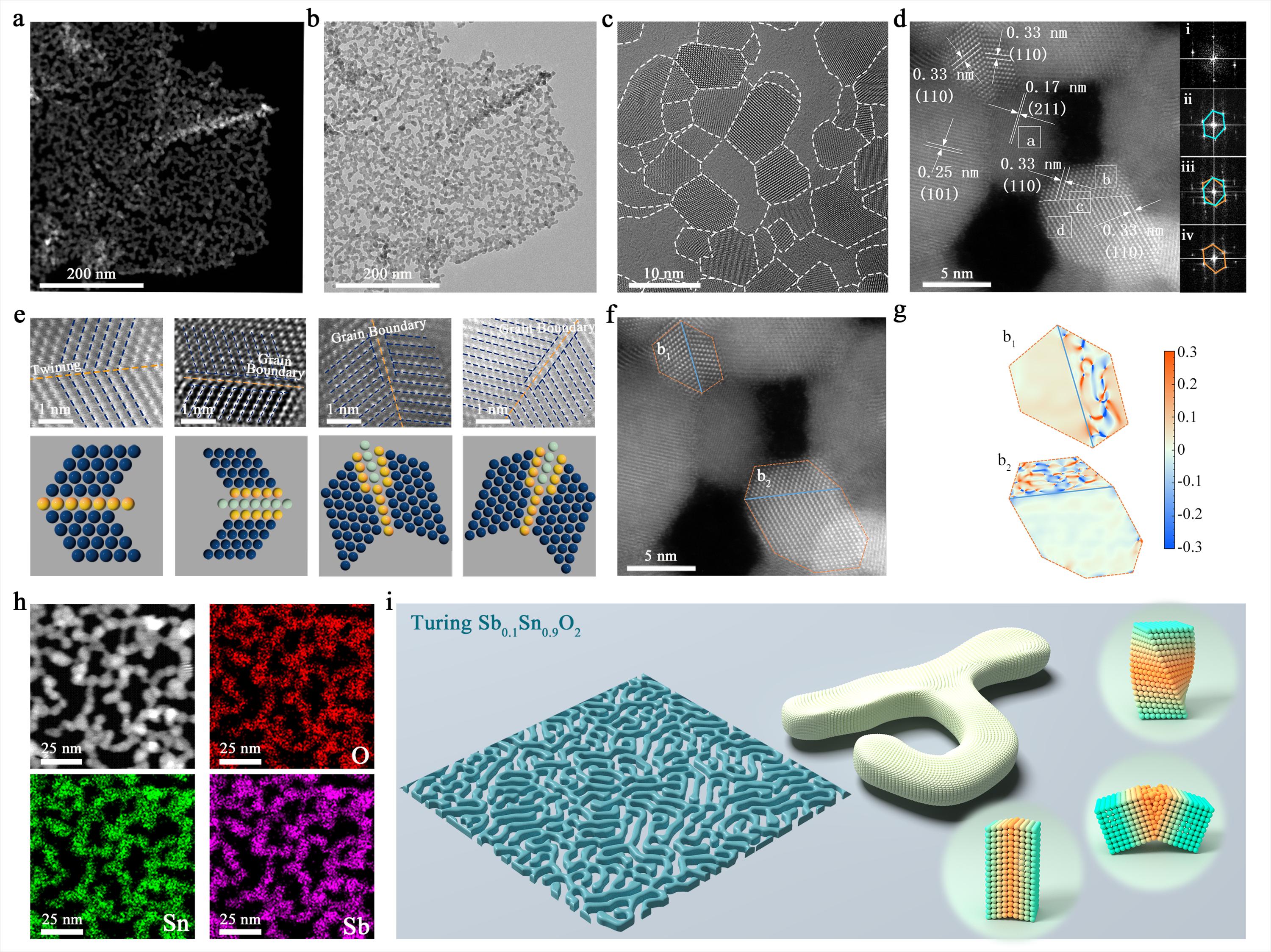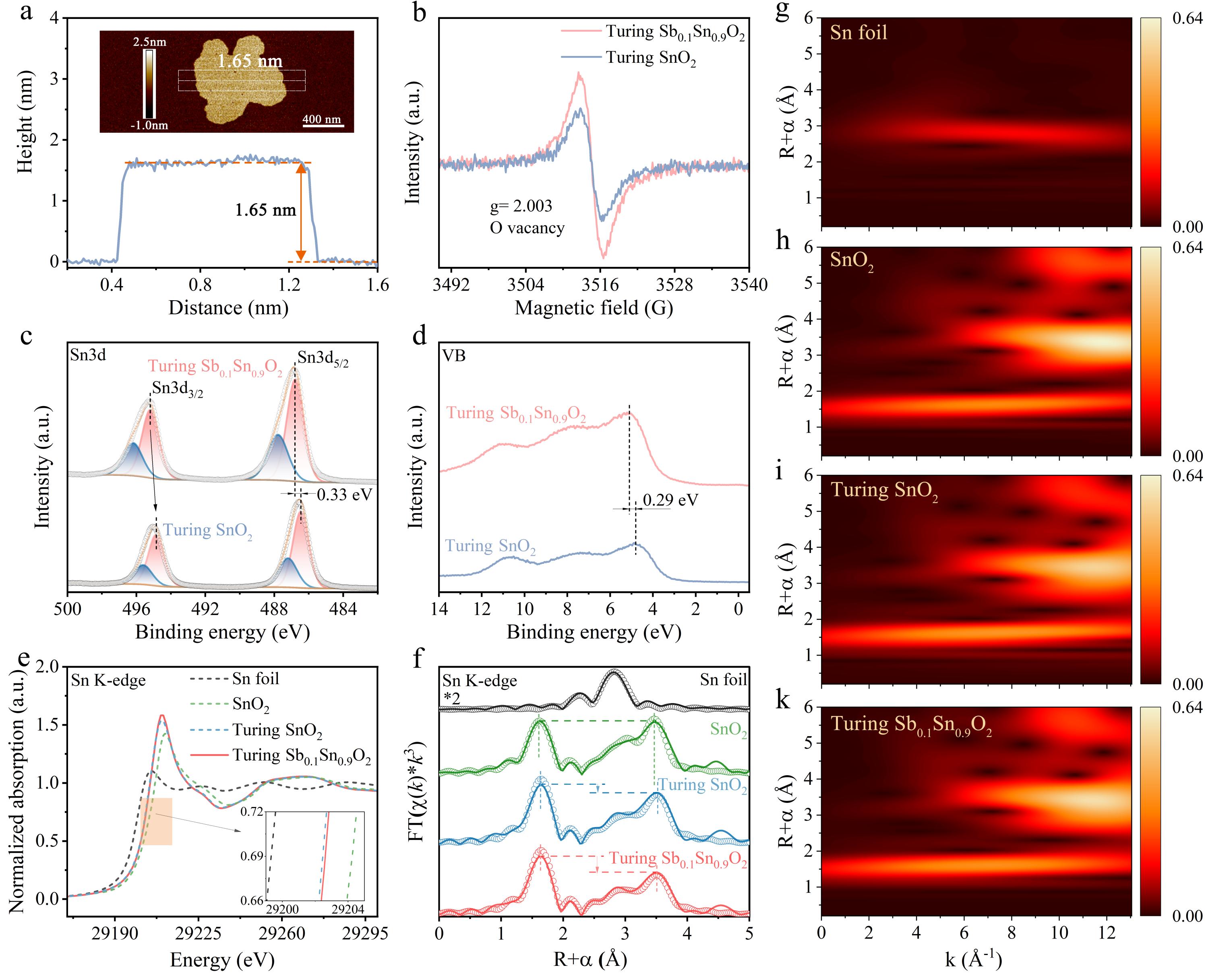 该研究工作提出一种普适性方法制备了富晶界的多孔图灵型氧化锡锑纳米片催化剂(图1&2)。原子力显微镜表征结果(图2a)揭示了图灵型氧化锡锑纳米片的超薄特性。电子顺磁共振(图2b)和扩展X-射线精细表征结果(图2f)证明了图灵型催化剂具有富缺陷和低配位数的特征。