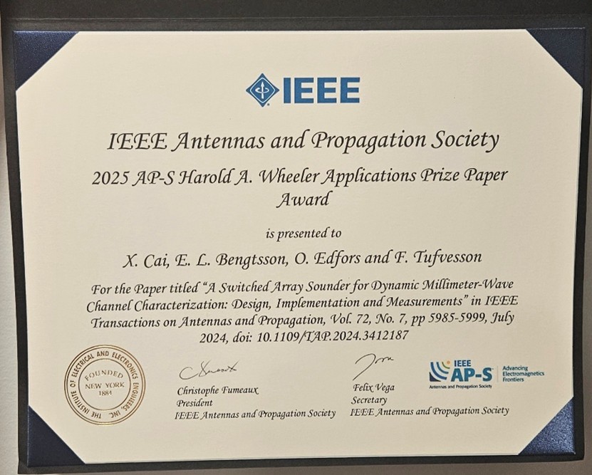 近日,北京大学电子学院蔡雪松预聘副教授作为第一作者兼通讯作者在天线与传播领域顶级期刊IEEE Transactions on Antennas and Propagation(IEEE TAP,中科院1区)发表的论文“A Switched Array Sounder for Dynamic Millimeter-Wave Channel Characterization: Design, Implementation, and Measurements”荣获2025年度IEEE天线与传播学会哈罗德・A・惠勒应用论文奖(Harold A. Wheeler Applications Prize Paper Award)。其合作者包括瑞典索尼欧洲研究中心研究员Erik L. Bengtsson,瑞典隆德大学电气与信息技术系教授Ove Edfors,瑞典隆德大学电气与信息技术系教授Fredrik Tufvesson。
