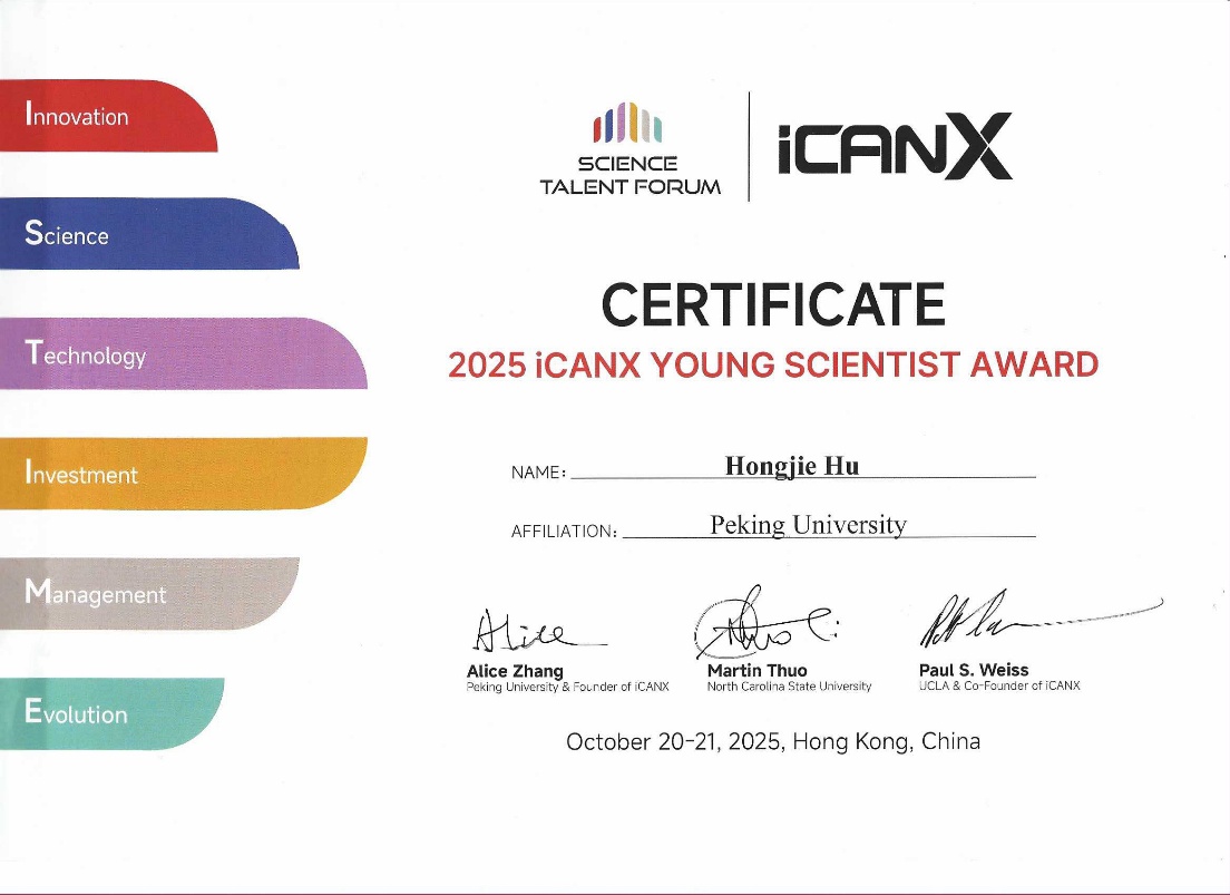 颁奖典礼上,iCANX青年科学家奖、iCANX创业奖和iCANX创新奖正式揭晓,来自世界各地知名大学和研究机构的杰出青年学者参与竞选青年科学家奖,最终10人获此殊荣。其中,北京大学集成电路学院助理教授胡鸿杰凭借其在可穿戴超声成像技术领域的研究成果与发展潜力成功获得iCANX青年科学家奖。