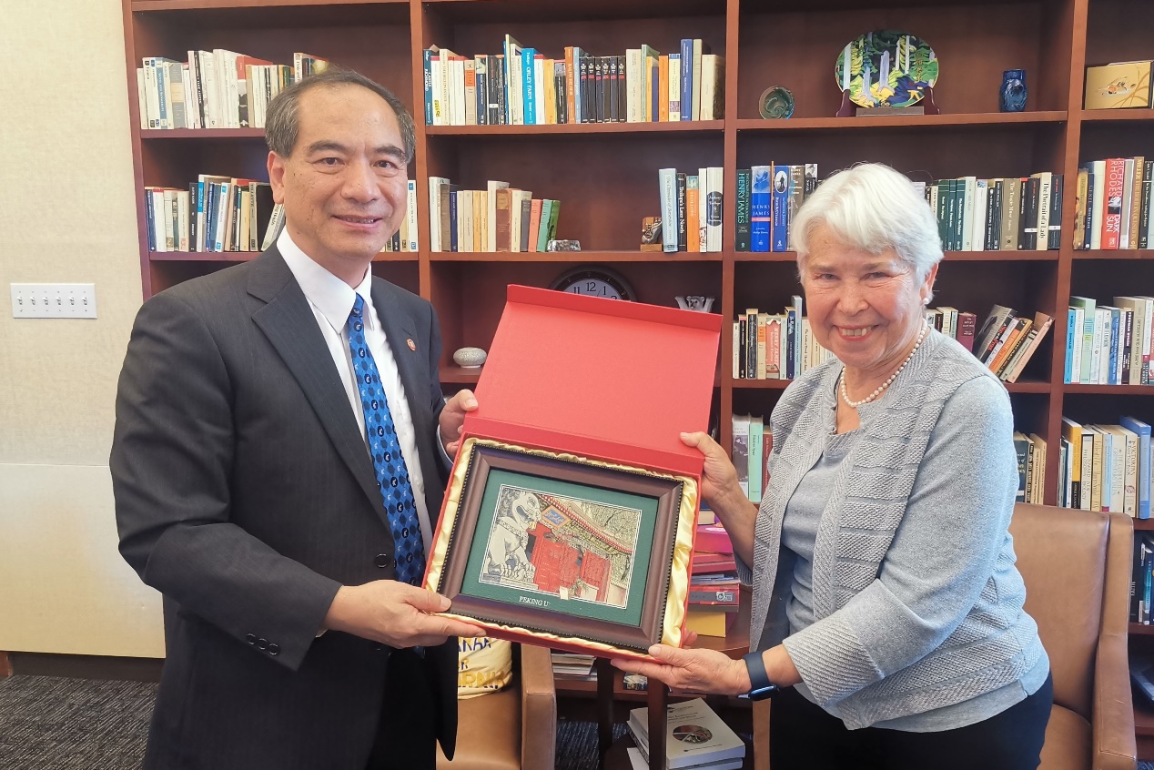 访美期间,龚旗煌一行还拜会了中华人民共和国驻旧金山总领事张建敏,就进一步开展中美教育领域交流合作等内容进行深入探讨。龚旗煌表示,今年是北京大学“国际战略年”,将利用此次访问契机,持续发挥北大在扩展中美教育领域合作的重要作用,深入沟通相向而行,深化中美人文交流与合作。他还介绍了北大在今年开展的一系列加强国际合作举措。张建敏对代表团一行访美表示欢迎,并指出,中美教育领域交流互鉴需求始终强烈,希望以北京大学为代表的中国高校与海外高校及机构在科教领域继续深化合作,进一步促进高等教育高水平对外开放。