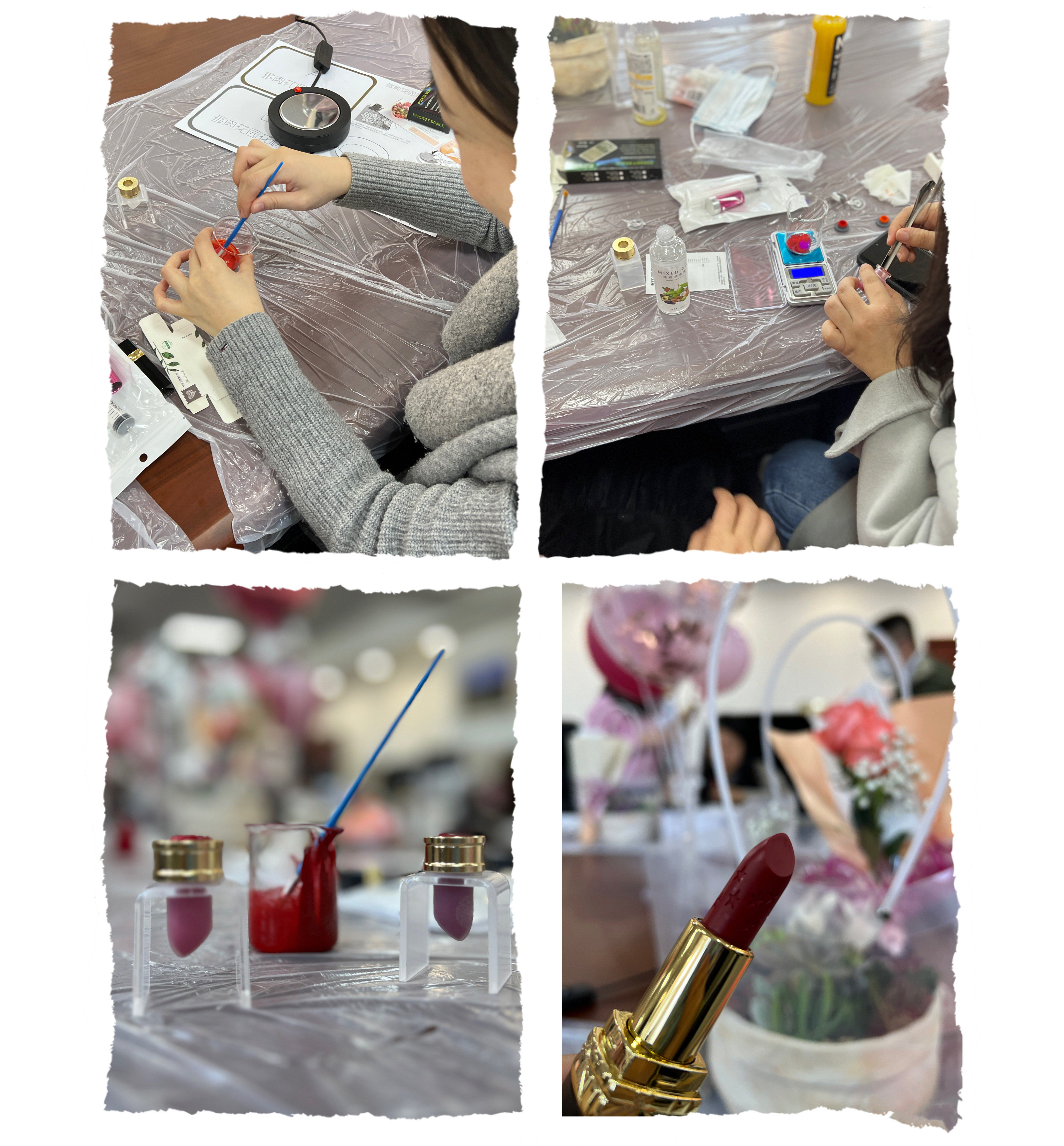 接下来是口红“DIY”手工制作环节。工作人员将制作口红的模具、烧杯、电子秤等工具准备好。随后,大家在专业老师的指导下挑选自己喜欢的色粉,有条不紊地进行称重,加入植物油、蜂蜡等材料,再经过研磨、加热、凝固、脱模等系列操作。每个人都在专心致志地雕琢着自己的“作品”,不一会,一支支精美的口红就制作完成了。大家纷纷沉浸在收获的喜悦当中,有的发朋友圈分享自己的劳动成果,有的拍照记录美好瞬间,现场气氛轻松愉悦。