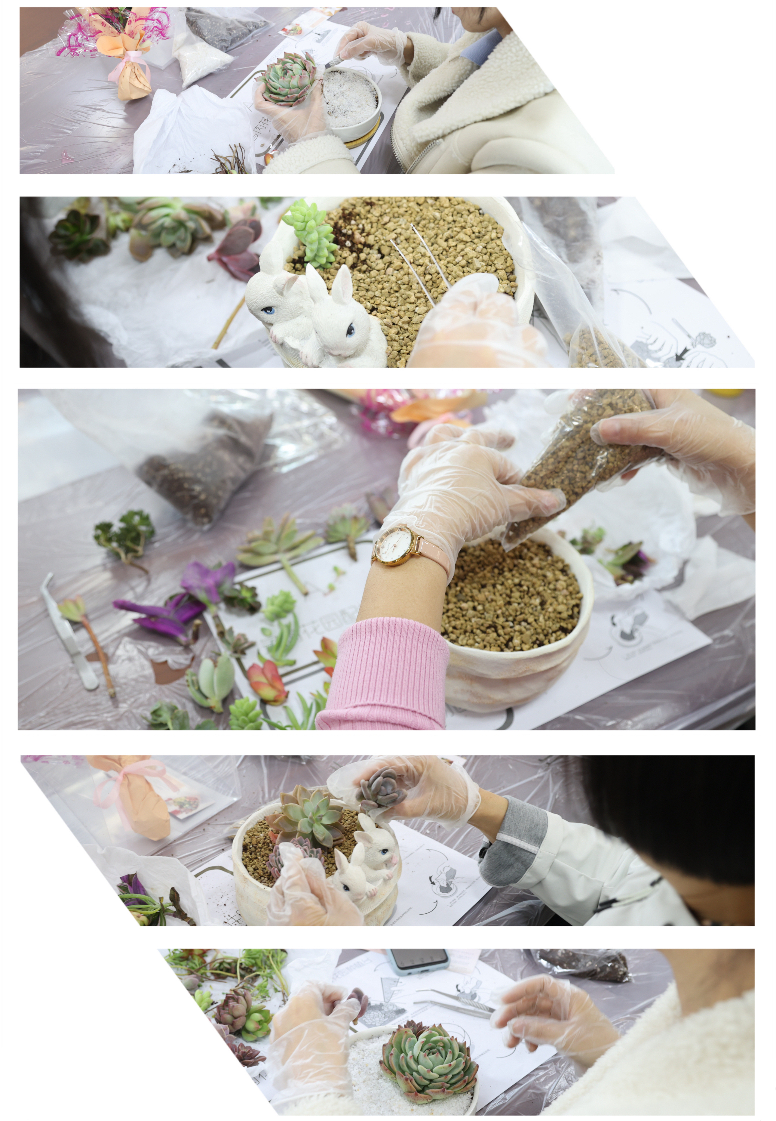 活动开始,首先是“指尖森林”微景观制作环节。现场为大家准备了花盆、多肉植物、营养土、装饰物等各式各样的制作材料。由花艺种植指导师为大家讲解微景观设计相关知识,介绍微景观制作步骤。大家一边认真学习,一边手持工具饶有趣味地制作起来。大家纷纷变身成为“巧手花匠”,尽情发挥想象力,建构属于自己的“魔法森林”。巧手翻飞间,一件件奇妙精致、各具特色的“纯手工艺术品”新鲜出炉。大家在亲身享受制作盆栽的乐趣的同时,还获取了多肉植物的养护知识。