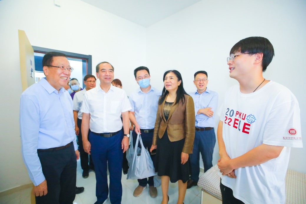 2022年9月1日上午,北京大学党委书记郝平、校长龚旗煌到北大新校区调研。副校长王博,党委副书记、纪委书记顾涛,党委副书记、副校长宁琦,副校长董志勇、张锦,以及有关职能部门负责人,入驻新校区的电子学院、计算机学院、集成电路学院、智能学院负责人等陪同调研。