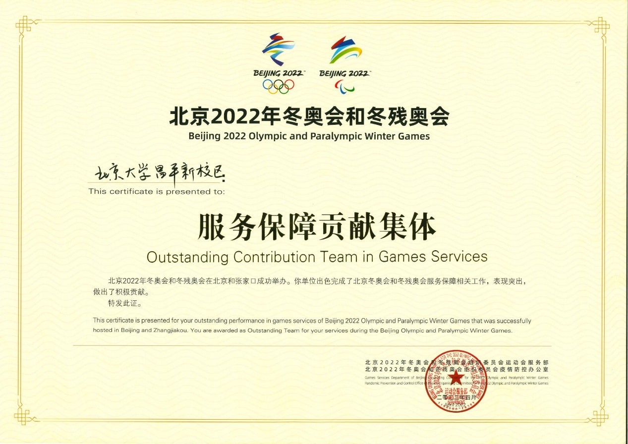 2022年1月至4月,北京大学昌平新校区作为北京冬奥会和冬残奥会规模最大的高校主责志愿者驻地,为北京冬奥会和冬残奥会的成功举办作出了重要贡献。近日,昌平新校区被北京2022年冬奥会和冬残奥会组织委员会运动会服务部、北京2022年冬奥会和冬残奥会组织委员会疫情防控办公室评为北京2022年冬奥会和冬残奥会服务保障贡献集体。