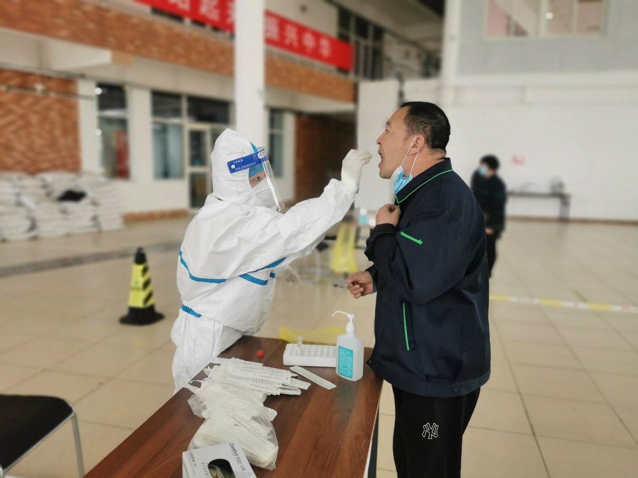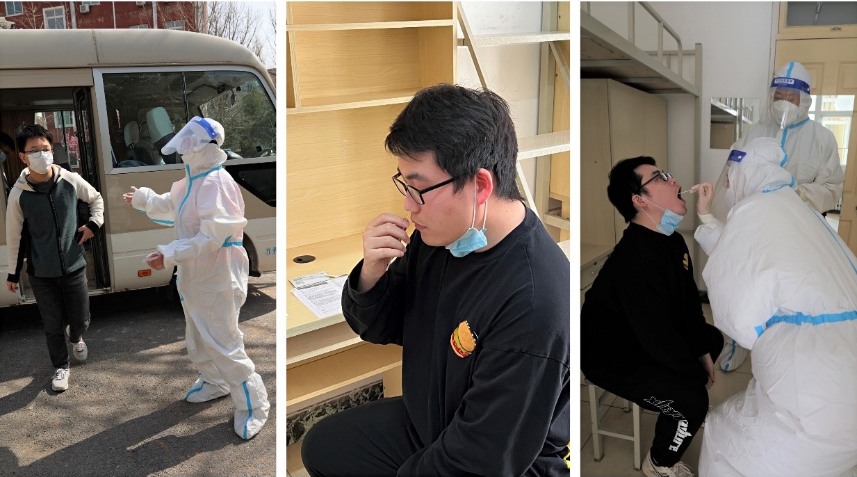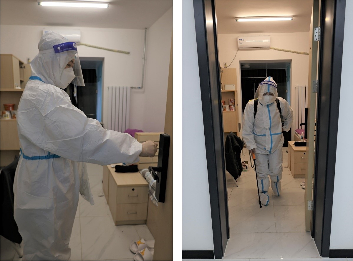 工作人员第一时间穿戴防护装备,乘坐应急车到达疑似病例及密接者所处点位楼下,将其转运至校内隔离点。隔离人员在校内隔离点做抗原自测及核酸检测。疾控中心将隔离人员转运离校后,校内全体人员开展集体核酸检测。环境采样和消杀伴随隔离人员校内转运路径同步进行,工作人员最终对其他重点场所及公共区域开展环境采样和全面消杀后演习结束。