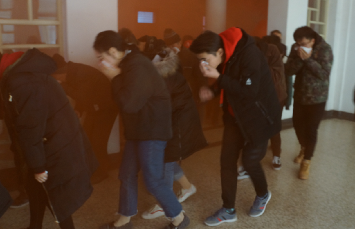 消防控制室在安全主管的组织下,发出应急广播,并提醒禁止乘坐电梯。疏散引导组在楼层疏散员的配合下,有序引导楼内人员疏散,要求逐一检查,做到一个不漏。同时,广播提醒大家尽量用湿毛巾折叠,捂住口鼻,弯下腰,屏住呼吸,快速撤离到主楼前空旷区域。