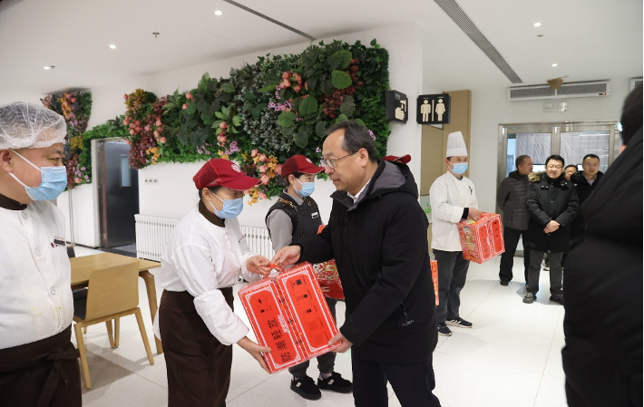 张锦首先来到新燕园校区南门,看望慰问正在站岗值守的保安员,了解大家的工作生活情况,并送上了新年慰问品。张锦感谢大家为保障新燕园校区安全稳定做出的贡献,并叮嘱执勤保安员注意防寒保暖。