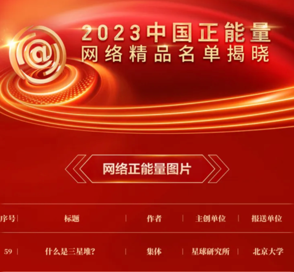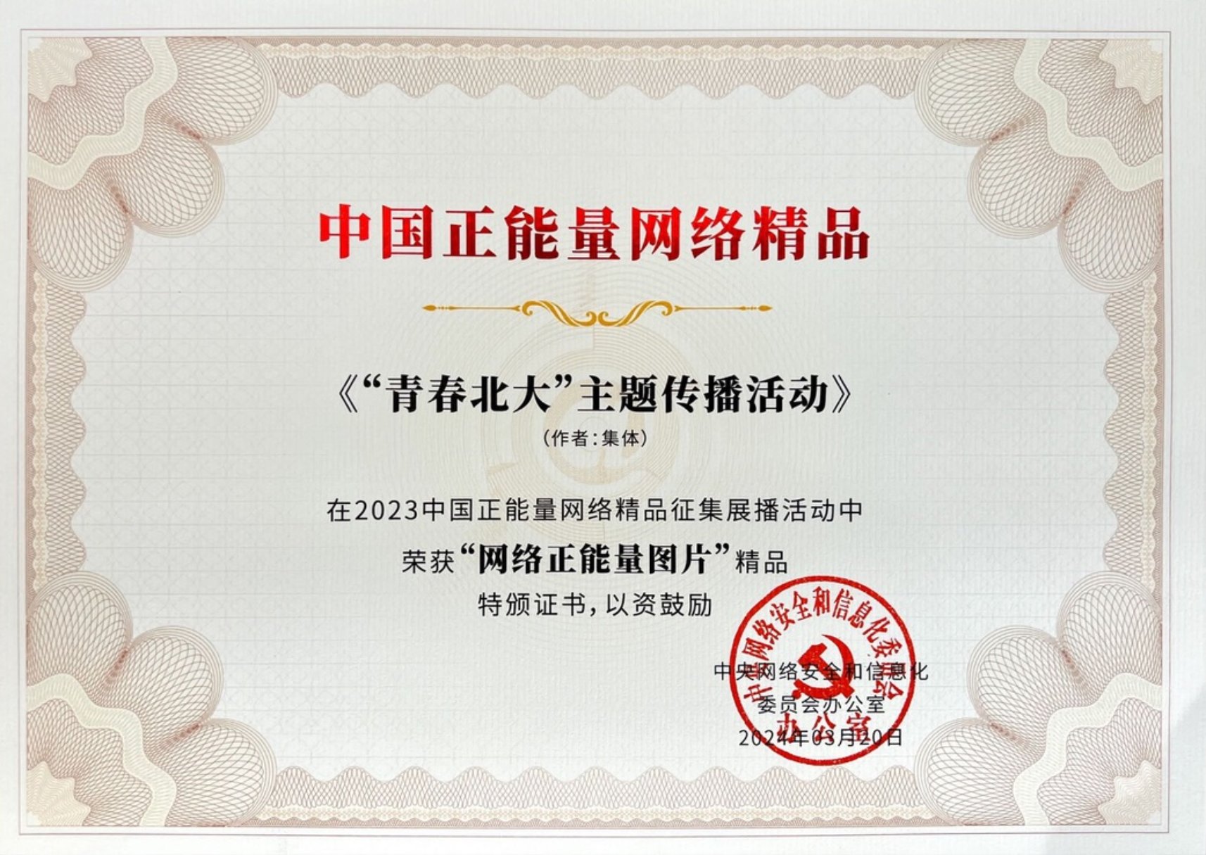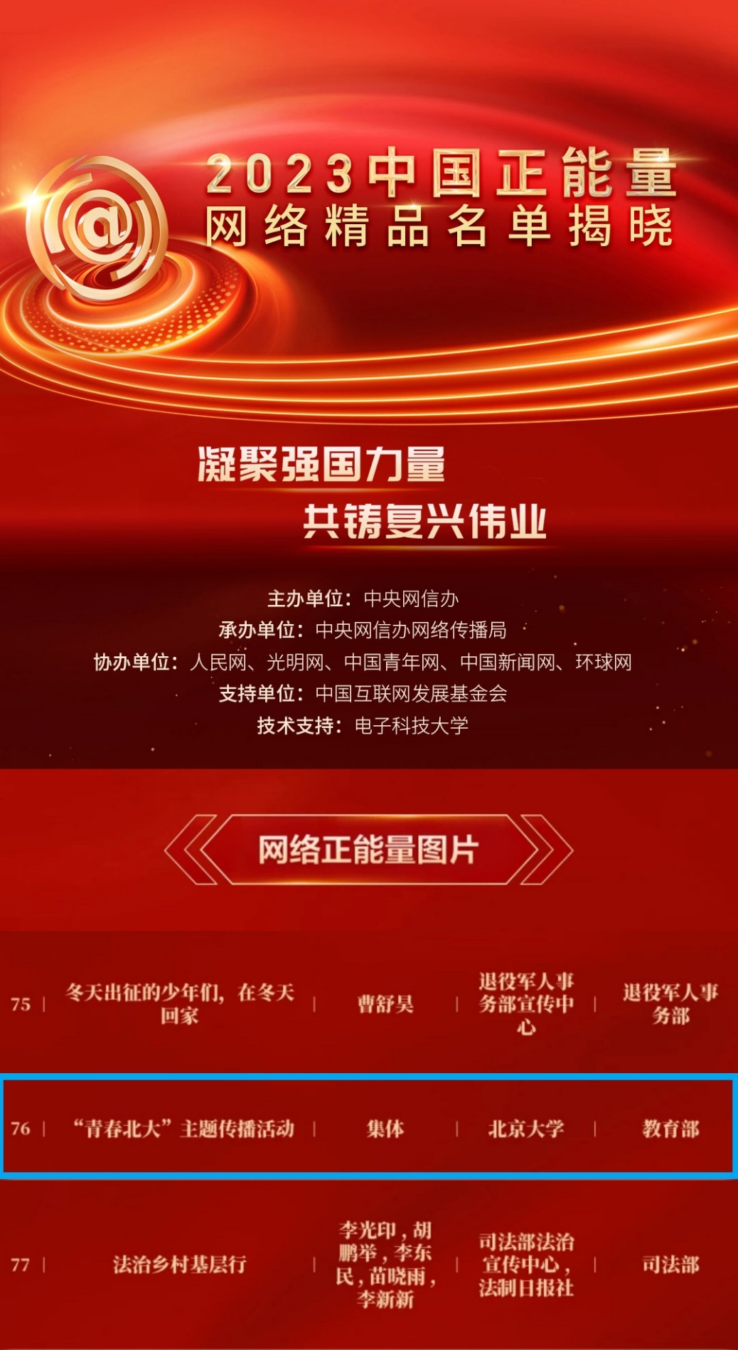 由中央网信办主办的2023中国正能量网络精品终选结果日前正式出炉,五个大类、550件网络精品脱颖而出。由北京大学创作的“‘青春北大’主题传播活动”榜上有名,获评“网络正能量图片”大类百强之一。