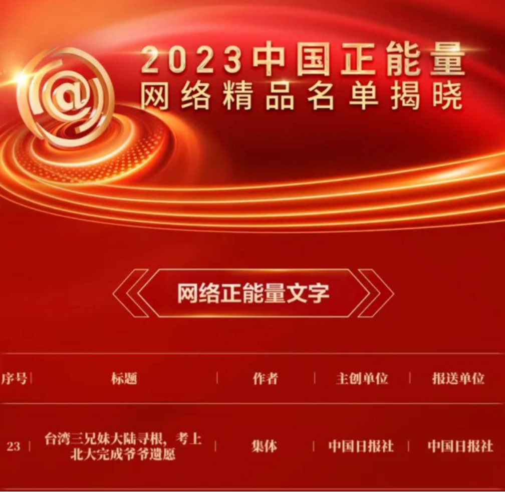 此外,北京大学融媒体中心与星球研究所联合出品的《什么是三星堆?》,由北京大学报送参评最终获评网络正能量图片作品;由中国日报社主创、北京大学融媒体中心等多部门参与的《台湾三兄妹大陆寻根,考上北大完成爷爷遗愿》获评网络正能量文字作品。