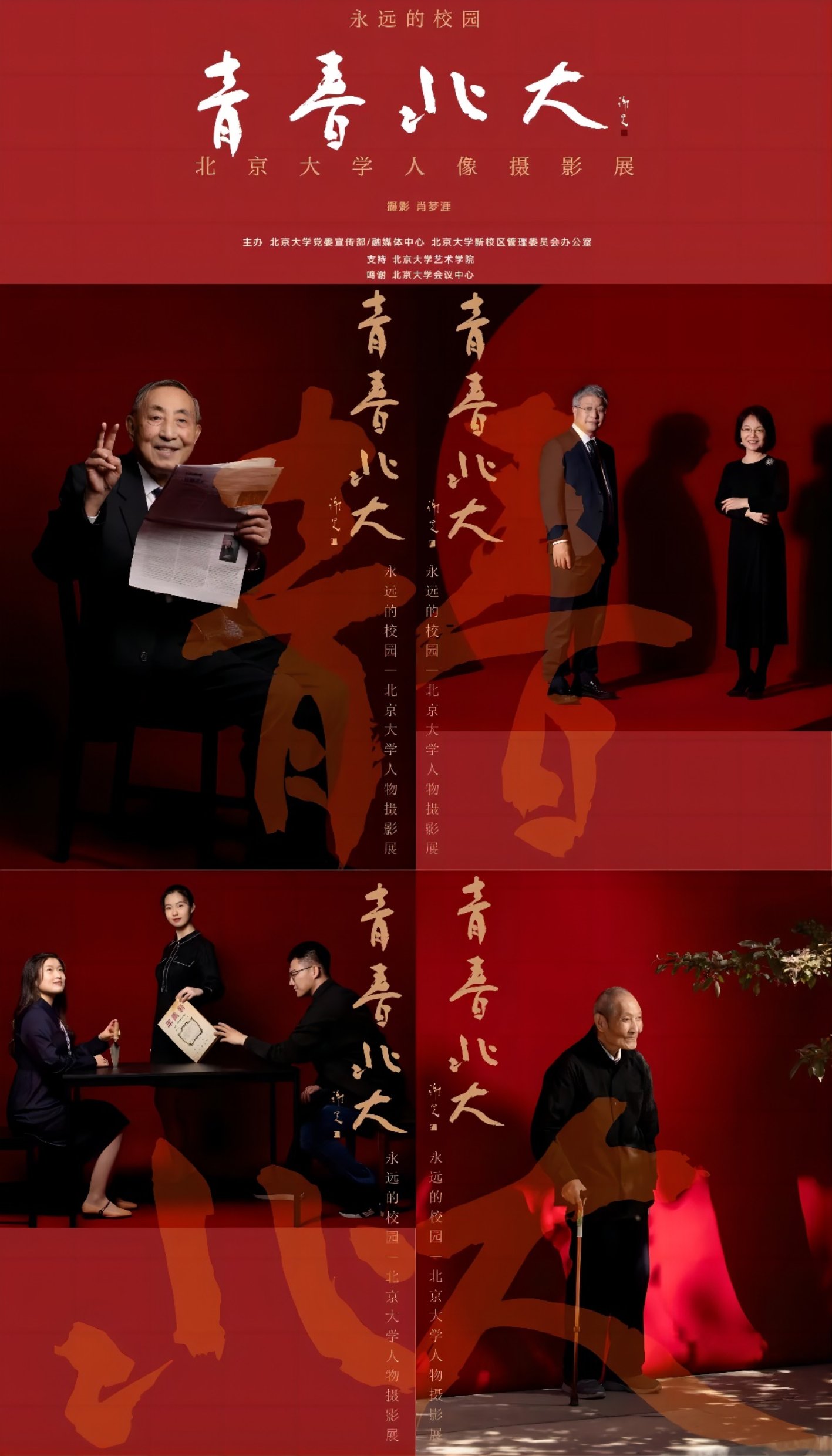 “青春北大”人像摄影展邀请艺术学院2021级博士研究生肖梦涯掌镜,以“青春”为题,从生命、学术、同窗、同侪、爱情、亲情等多个维度铺展开来。在4个多月的时间里,肖梦涯以“北大红”为线索串联,于燕园、新燕园、老先生家等多处取景,用镜头记录下了乐黛云先生、王义遒先生、郭弘吴腾师徒、程和平肖瑞平夫妇、李世乾李世坤兄弟、燕京学堂中国学硕士研究生项目学生代表等34组59位“老中青”北大人跃动着的青春,定格他们在北大的传承、至情与韶华,以此致敬每一位激昂奋进的北大人。摄影展于2023年6月16日至30日在北京大学百周年纪念讲堂展出,社会各界反响热烈、好评如潮。目前,展览正在新燕园校区公共教学楼持续展出。
