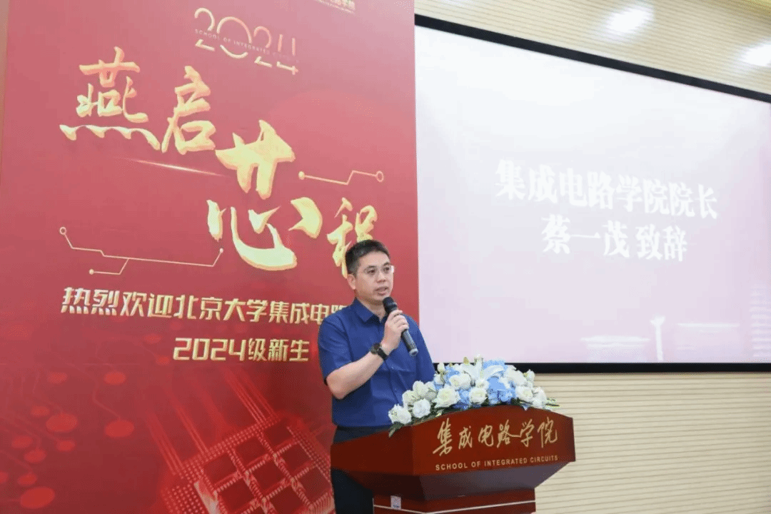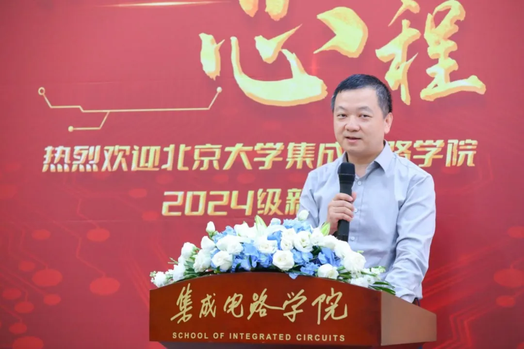 集成电路学院院长蔡一茂发表迎新致辞。他代表学院全体师生员工,向新生表示热烈的祝贺和诚挚的欢迎。他回顾了学院辉煌的历史与成就,祝愿新生们以“芯”怀理想、勇于创新、坚韧不拔的精神,积极投身于国家科技发展的浪潮中。他强调,作为新时代的北大学子,同学们应勇于担当时代赋予的历史使命,将个人梦想融入国家复兴的伟大事业中,以不懈的努力和卓越的成就,为祖国的繁荣富强贡献青春力量。最后,他衷心祝愿每一位新生都能在北大这片沃土上茁壮成长,成就非凡,共同书写集成电路领域的新篇章。