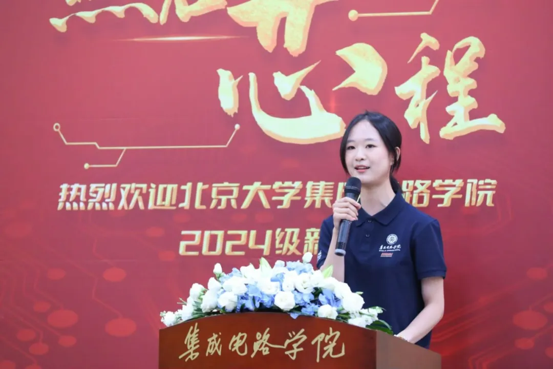 北方集成电路技术创新中心(北京)有限公司总经理康劲校友,集成电路学院教师代表张兴教授,集成电路学院院长蔡一茂,党委书记王源、党委副书记刘军华,副院长刘晓彦、鲁文高,班主任韩金池,教务办学工办老师、辅导员,以及学院2024级新生参加典礼。典礼由党委副书记张舒主持。