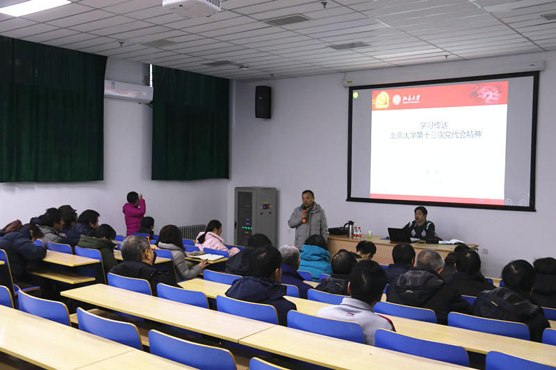 2017年12月15日上午,继续教育学院党总支书记李胜来到昌平校区图书馆西报告厅,为昌平校区广大党员和群众传达北京大学第十三次党代会精神。党总支委员、教工一支部书记、昌平校区管理办公室副主任王文彦和30余名教职工一起聆听党课。