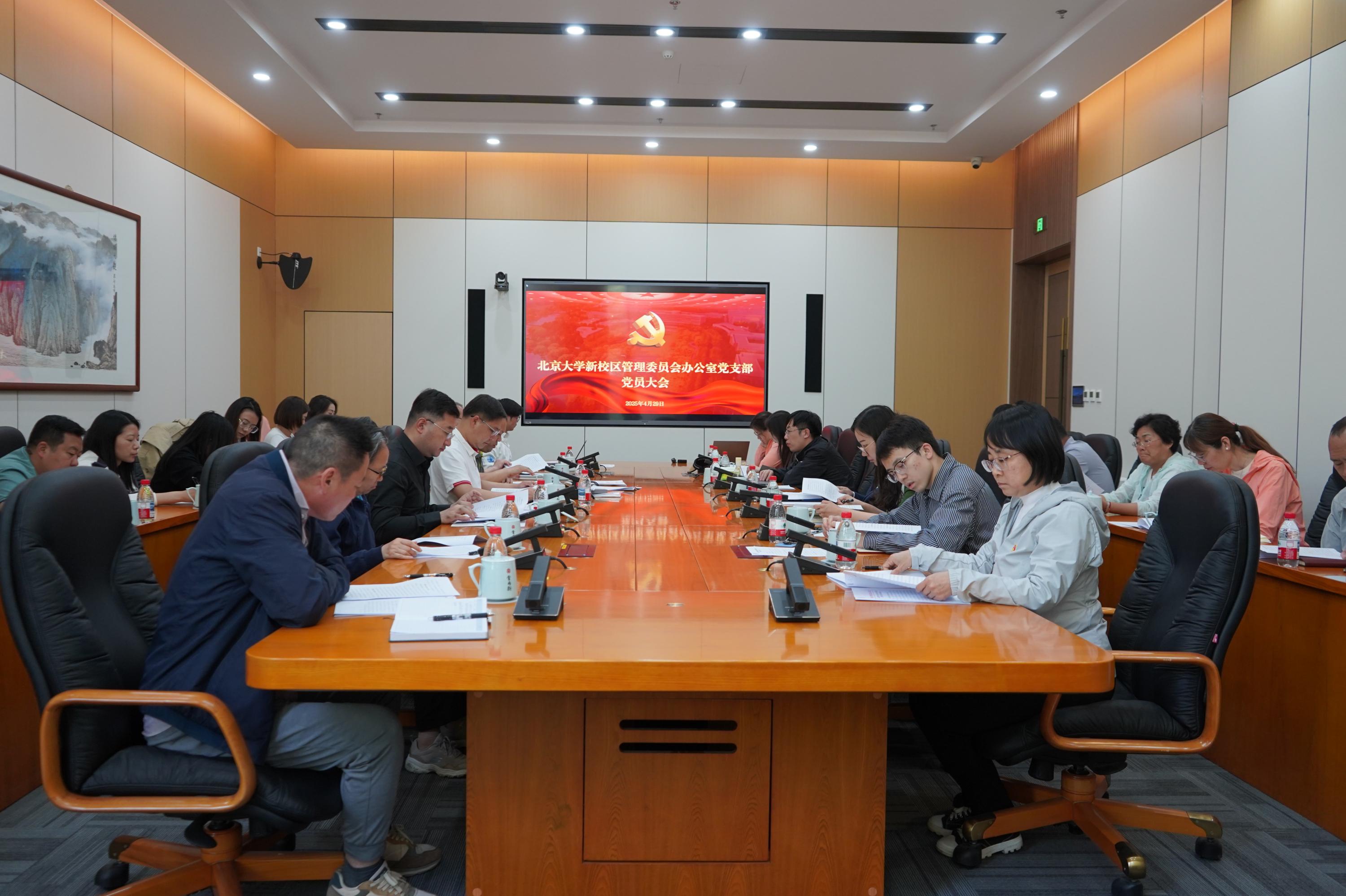 2025年4月29日下午,新校区管理委员会办公室(以下简称“新校区管委办”)党支部在新燕园校区学术交流中心召开全体党员大会,深入贯彻中央八项规定精神学习教育,开展集体学习,通报相关事项,坚持聚焦主题、简约务实,一体推进“学查改”。新校区管委办在职党员、入党积极分子、仍在岗工作的退休党员及部分退休党员参加。